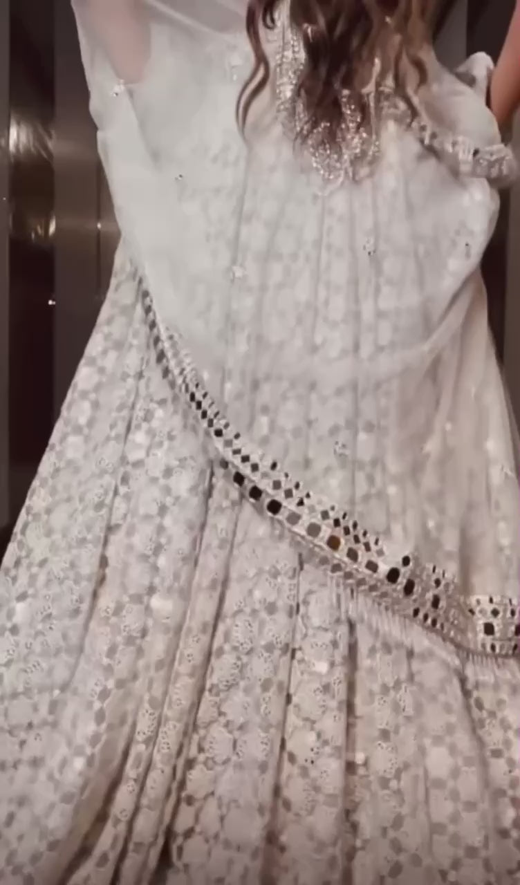 White Color Heavy Thread With Papper Mirror Work Designer Lehenga Choli